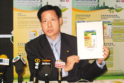 ■王錫章表示,強制性能源效益標籤計劃昨起實施,冷氣機、雪櫃及慳電膽均須附有能源標籤,才可於全港3,000個零售點發售。 本報記者嚴敏慧 攝