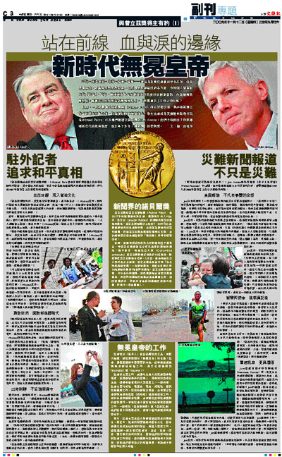 ¡@¤W©P¡A¤@¯Z¬ü°ê´¶¥ß¯÷·s»D¼ú¡]Pulitzer Prize¡^±o¥D³QÁܳX´ä¡A»P¥»´ä·s»D¤u§@ªÌ©M¾Ç¥Í¤À¨É¤ß±o¡C°OªÌ«K³X°Ý¤F´XÓ±o¥D¡A²v¥ý¥X³õªº¬O¬ü°ê³ø³¹¾n®ü¥~°OªÌMichael Parks¡A¥H¤Î±Mªù³ø¹D¨aÃø·s»DªºJim Amoss¡C¥L̤£¦ý´£¥X¤F¦^À³¶Ç´C·s¥@¥NªºÀ³¦³ºA«×¡AÁÙ¤À¨É¤F¦h¦~¡u¶]·s»D¡vªºW»P¼Ö¡C