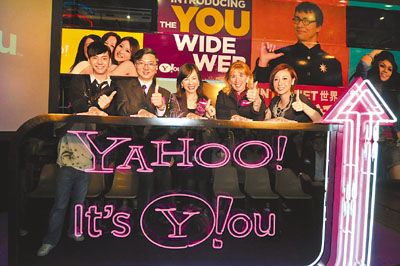 ■陳偉霆(左)及泳兒(右)與眾雅虎高層出席啟動儀式。