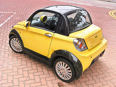 據了解,My Car的設計意念,源自一代汽車設計名師喬治亞羅手筆,只不過經過了不斷改良,才出現現時的設計而已,所以在造型上仍看到不少大師級的筆觸,而且亦無損那度身訂造的可愛賣相。My Car外形愈形卡通化,就更顯出它的不平凡,雖然在裝嵌手工上它仍有可上調空間,但礙於這是本港首次推出製造汽車,一些不善之處仍是值得原諒。車身外殼大部分皆以玻璃纖維物料製造,用意是減輕車身負重,在外形上,My Car則盡顯了小汽車設計的專長——惹人注目、短小車身、高聳車頂、巨大輪圈,似是極不協調,但所有元素放在它身上,卻是非常適合不過,再留意一下,前後輪拱也用上了外拋形設計,讓車身更見豐滿圓潤,車頭賣相頗為討人歡心,立體覆蓋式頭蓋線條分明,跟車側腰線起了強烈的層次感,與圓渾的防撞桿相比,則起了特別的視覺化學作用。不設外燈罩的立體頭燈,以碳灰色燈座營造出當中的不平凡,把車頭氣氛包裝得與別不同,加上特大入風柵格與圓形指揮燈,讓其表情更加豐富得多。高聳的車頂與A、B、C柱,均以統一的黑色處理,令它跟車身外顏色形成了強烈對比,同時亦加強了Two Tone Color感覺;車尾勾劃以短小型尾箱配合較方角形設計,與車頭相比有較大對比,但卻全無突兀感,反而造就了更強的視覺效果,把線條描繪得更加突出。另外,四個貌似巨大的多幅式輪圈,其實只是車身太小下的美麗誤會而已,因為它配用的只是165/60R14或165/50R15輪胎,但視覺效果卻是出奇的好。