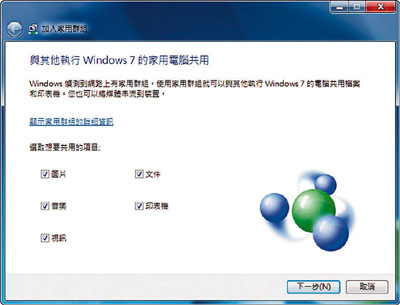 Windows 7能讓你輕易地與家人分享檔案或設備,如打印機、掃描器,甚至相片、音樂、DVD等,只需Click幾下,加入HomeGroup,家中幾部電腦即可同時分享共用,其DeviceStage功能,能顯示你所有連接設備的狀況,例如相機和流動電話,並讓你更輕易進行同步更新和管理。而且,在Windows 7系統下,你可在任何地方都輕易搜尋可用的無線網絡,只需在桌面的右下角一按,就可顯示所有網絡,能容易地選擇你想使用的網絡。