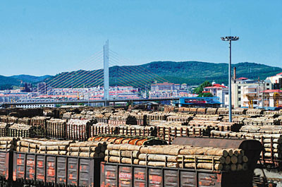 ■木材貿易始終是中俄貿易的重頭戲,圖為滿載俄羅斯木材的火車停靠在綏芬河貨場。