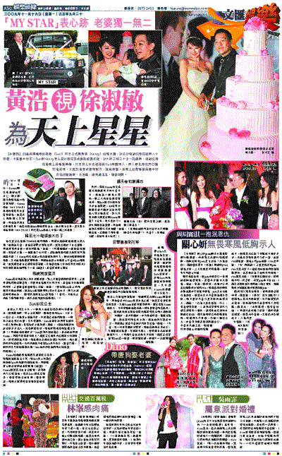 昨午一時三十分,Kenny與兄弟團包括鈴木仁、周文健、楊天命等抵達W酒店接新娘,Kenny乘坐「MY STAR」車牌的黃色私伙吉普車到場,他表示心情既開心又緊張,問他為何用自己車做花車?他表示因為Suki嫌棄房車老土,他才用自己車,更大賣口乖指車牌「MY STAR」即代表Suki是他心中獨一無二的星星!