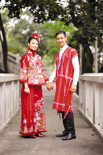 ■Dino(右)穿上緬甸新郎禮服,迎娶老婆Nancy(左)。