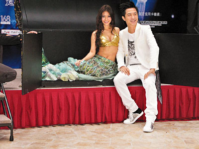 【本報訊】(記者 李思穎)庾澄慶(哈林)將於明年1月9、10日假紅館舉行兩場《庾澄慶無底深愛巡迴演唱會》演唱會,為了配合「深海」主題,昨日的記者會特地在酒店的泳池旁舉行,挾著寒冷天氣警告,大會安排口靚模A.Lin冒寒化身性感美人魚上陣,「谷胸」美人魚造型的A Lin無懼寒風刺骨,她的出場令現場升溫,搶去哈林不少風頭,反見哈林在性感女郎前顯得害羞,目不斜視,表現生硬。