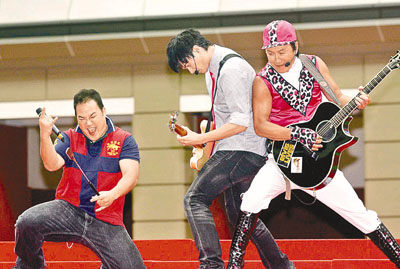 ■阿Sam在台上和兒子懷欣、懷谷齊唱《半斤八襾》。