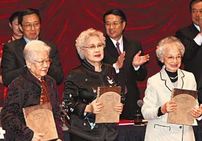 ■張瑞芳、秦怡、王丹鳳(左起)等藝術家被授予「上影60年傑出電影藝術家」榮譽稱號。新華社