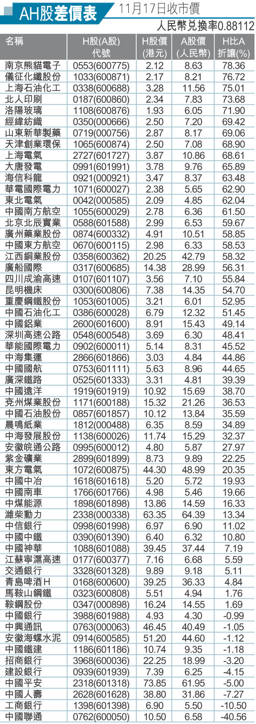 AH股差價表(11月17日收市價)