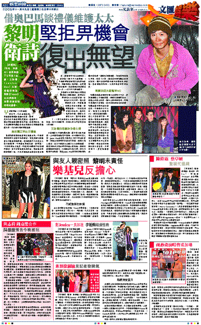 另提到太太樂基兒在公眾場合與其他人態度親近,黎明幫口解畫指太太出生於美國,生長地方文化不同,請大家別想得太多,即使擁抱也屬正常社交禮儀,黎明維護說:「我會尊重美國人的生活,像奧巴馬來訪中國,應該大方便要大方,請不要想歪了。」所以他接受太太是美國式女孩的性格,也不向她查問,要是大事自然會有其他人來相告。