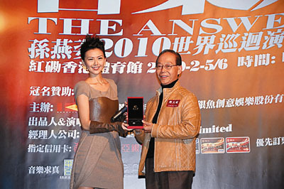 【本報訊】(記者 梁靜儀)孫燕姿《答案是...孫燕姿2010世界巡迴演唱會-香港站》將於明年二月五、六日假紅館舉行,昨日她以FENDI秋冬新裝出席記招,大會還宣布兩場優先訂票已沽清。記者會上燕姿揮舞長劍並由四位武士打扮的舞蹈員陪同出場,贊助商大福更送上美鑽吊墜給她,之後又開香檳預祝演唱會成功,燕姿雙手掩耳顯得極為興奮。