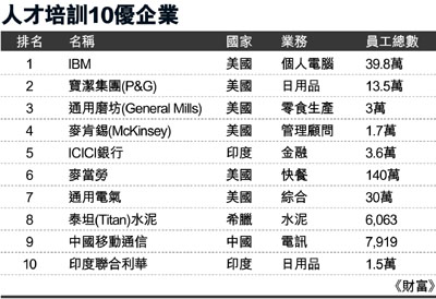 美國有線新聞網絡(CNN)選出全球10間培訓領導才能最出色的企業,表揚他們之餘,也堪作其他同業借鏡。跨國電腦業巨擘國際商業機器(IBM)榮登10優之首,中國移動通訊集團的上海公司,也憑藉一套獨特培育人才政策而排名第9。