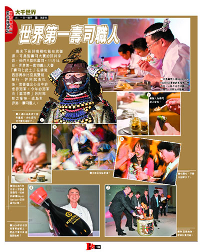 周末下班到哪裡吃飯任君選擇,可是對壽司大賽的評判來說,他們只能吃壽司。11月14日,世界第一壽司職人大賽「壽司七武士」在倫敦西部奧林比亞展覽館舉行,評判試食以後,需要選出心目中的世界冠軍。今年的冠軍由「壽司善」的阿部智之獲得,成為世界第一壽司職人。