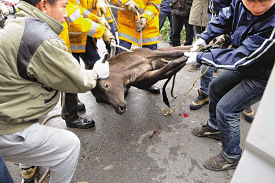 小黃牛由於四肢受傷,加上天氣寒冷及受驚,不斷顫抖及咆哮。漁護署人員接報到場,為小黃牛初步檢驗,認為其傷勢須要醫治,決定運往動物處理中心。