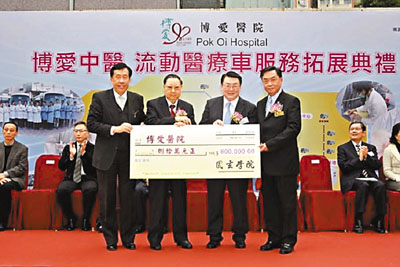 博愛醫院董事局主席潘兆文於致辭中表示,博愛近年積極拓展中醫服務,現在設有2間中醫臨床教研中心、5間中醫專科診所及10部中醫流動醫療車。博愛醫院去年建議「公私營醫療服務合作計劃」,得到食物及衛生局、衛生署及醫院管理局的支持,讓3部中醫流動醫療車於觀塘賽馬會健康院、新蒲崗柏立基健康院及馬鞍山健康中心開展服務,每星期5天應診,全部免收診金。