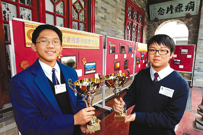 ■「中國現代建設組」冠軍華仁書院邱晉樂同學與「中國名山大川組」冠軍東華三院伍若瑜夫人紀念中學王信民同學於典禮上合照。