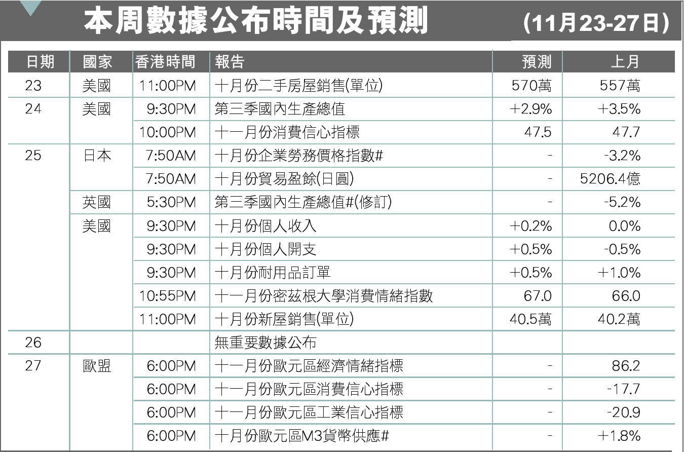 本周數據公布時間及預測(11月23-27日)