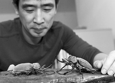 ■迷戀昆蟲的郝健在瀋陽建立「昆蟲文化工作室」,養殖40多個種類的1,000多隻幼蟲和成蟲。圖為他飼養的兩隻毛象大兜蟲。新華社