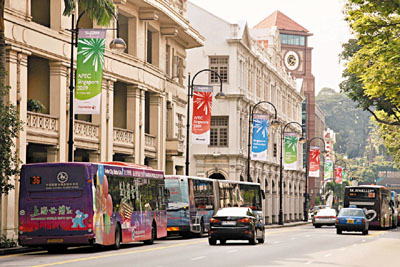 ■新加坡主要建築物及街道日前披上節日盛裝,迎接前來參加亞太經合組織會議的各國、地區的貴賓。 中新社
