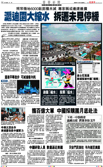 【本報上海新聞中心記者凌馨24日電】國家發改委23日宣佈,上海迪士尼樂園項目佔地116公頃(約合1,740畝),一下引發包括本港在內的輿論一片譁然,因為這一面積僅為新華社此前披露迪園一期佔地面積400公頃(約合6000畝)的29%,縮水逾三分二。而浦東新區9月下發的徵地公告卻顯示,迪園預留區內首批徵地面積仍為6000畝。同時,記者今天在採訪中了解到,目前拆遷工作仍在推進,未因迪園面積「縮水」而暫緩,由此外界猜測上海迪園後期將邊建邊擴、邊用邊擴。