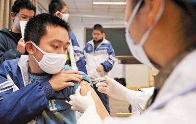 ■廣東省從本周起,將甲流疫苗的接種重點轉移到中小學生。圖為解放軍第23醫院的醫護人員24日在給烏魯木齊一中的學生注射甲流疫苗。 新華社