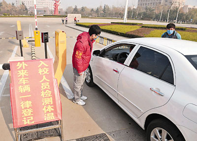 ■24日,山東省濰坊市濰坊學院甲流防控服務隊的成員在對入校車輛進行檢查。 新華社