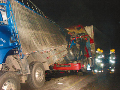 24日凌晨2時許,廣西南梧公路貴港市平南縣與藤縣交界路段,三輛大貨車連環追尾造成人員一死一傷,道路交通嚴重堵塞近5公里。 中新社