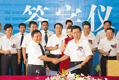 ■「煤老闆」薛德平(前左)與山西焦煤西山煤電集團董事長李建勝(前右)在兼併重組合作儀式上簽字。