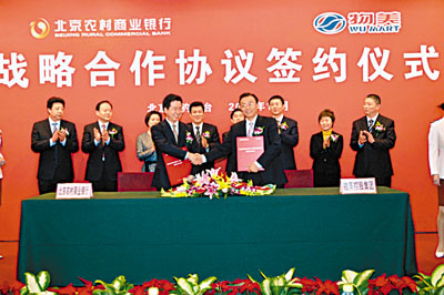 11月18日,北京農村商業銀行與物美集團在京簽署戰略合作協議。北京農村商業銀行在綜合授信、銀行結算、業務創新等領域給予物美集團支持,同時依托物美的超市資源,為京郊農副產品的供應銷售提供流通平台,為京郊經濟發展不懈努力。這是雙方全面落實「保增長、重民生、擴內需、調結構」的戰略方針,支持北京市經濟發展和產業結構調整的重要舉措。北京農村商業銀行王金山行長,物美集團吳堅忠董事長出席簽約儀式。北京農村商業銀行付東昇副行長與物美集團王堅平副董事長在合作協議上簽字。