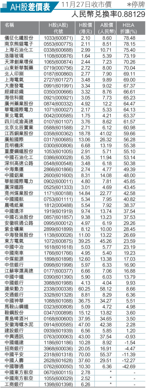 AH股差價表(11月27日收市價)