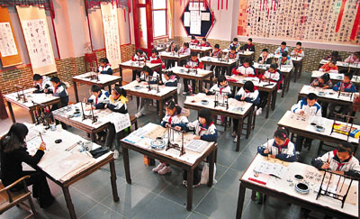 在蘇州工業園區蓮花學校的一間「特色書法教室」中,40名學生正在揮毫練習。 新華社