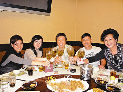■呂良偉、薛家燕和戚美珍幾位《富貴門》的演員聯同監製莊偉健宴請相熟傳媒宵夜,阿呂更帶同太太楊小娟出席。