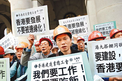 ■建造業總工會30名成員昨早到立法會外請願,促請政府盡快撥款及落實興建廣深港高鐵,增加工人就業機會。 本報記者梁祖彝 攝