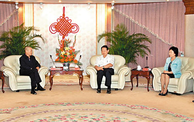 ■汕頭市委書記黃志光(中)接受香港《文匯報》社長助理、廣東新聞中心主任田炳信(左)專訪,汕頭市委常委、宣傳部部長陳茸(右)在座。 蔡友華 攝