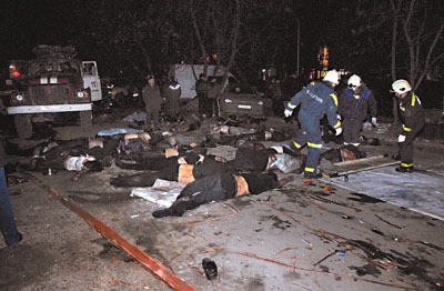 ■救援人員將多具燒焦屍體抬到夜總會外空地。 美聯社