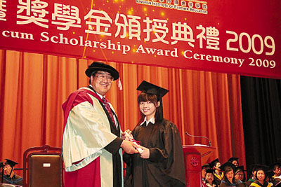 ■嶺大持續進修學院舉行08/09年度毅進計劃及文憑課程畢業禮,為近千名畢業生頒發證書。圖為馮培榮頒獎予獲5個獎項的陳璐瑜。 學院提供圖片