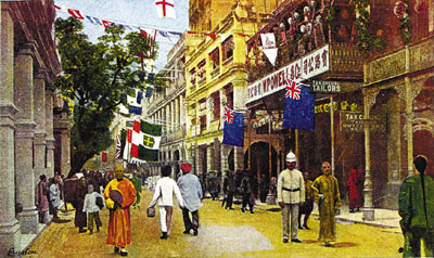 由昭隆街向東望。左面的屋宇於1920年代起改為商務印書館。大樹左面的高等法院於1924年改建為華人行。