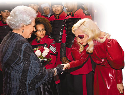 一向衣著打扮出位的Lady GaGa,昨日參與皇家大匯演總綵排時收起奇裝異服,以鮮紅的衣著和妝容亮相。英國女皇伊利莎伯二世也有到來觀賞支持,還於後台一一與Lady GaGa等握手見面。Lady GaGa更彎腰與英女皇握手,態度謙卑。