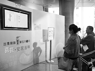 ■房委會第5期剩餘居屋單位昨日開始讓中籤人士揀樓,準買家全神貫注看著樂富房委會居屋客務中心的顯示屏,留意心水單位有沒有被他人選去。 本報記者譚靜雯 攝