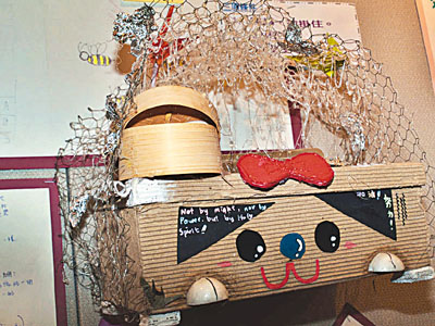 這些怪獸正反映了社會暴力、死亡和貧窮的現況,但原來當中也有一隻開心的怪獸。「它名字叫JuiCy July,它天生可愛活潑並樂於肋人。」林同學表示,怪獸不一定張牙舞爪,JuiCy July造型可愛,眼睛和鼻子像Hello Kitty,身體用紙盒製作而成,頭頂有一個蒸籠。「它性格開朗,每天露出開心笑容。」縱然社會每天上演悲劇,倘若細心發掘,也不難找到正面故事。