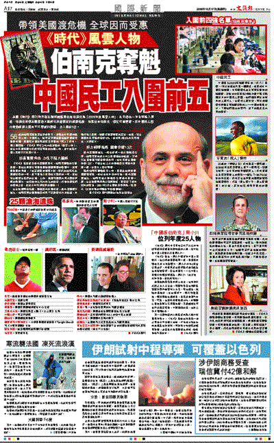 美國《時代》周刊昨天選出聯邦儲備局主席伯南克為「2009年度風雲人物」,表示過去一年全球陷入衰退,伯南克帶領美國渡過大蕭條以來最惡劣的經濟危機,如果沒有伯南克,情況可能更壞。而中國民工因在推動經濟方面有不可磨滅的貢獻,亦入圍前5位。