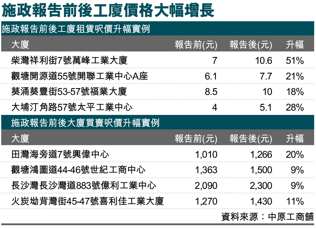 施政報告前後工廈價格大幅增長 (圖)