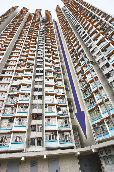 【本報訊】青衣h上月底發生狂徒擲大電視機落樓事件後,事隔僅17日,附近公屋長亨h亦出現擲物狂徒,疑有人從亨俊樓27樓電梯大堂將一個4呎高大型垃圾桶擲落街,幸跌落1樓石屎簷篷,沒有傷及街坊。警方事後大舉派員上樓搜查,惟未能將狂徒繩之以法。房署事後表示會加強巡邏,並考慮安裝天眼。