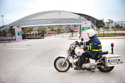 ■隨著澳門回歸10周年慶典活動臨近,活動場地澳門東亞運動會體育館加強了安保戒備。中新社