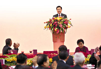 兩個多月前,我們一起滿懷喜悅地慶祝了新中國60華誕。60年來國家發展取得的輝煌成就,是全國各族人民在中國共產黨領導下團結一心、艱苦奮鬥的結果,也凝聚著澳門同胞的勤勞和智慧。我們堅信,在實現中華民族偉大復興的歷史進程中,澳門同胞和全國各族人民攜手並肩、不懈奮鬥,一定能夠創造國家和澳門發展的新輝煌!