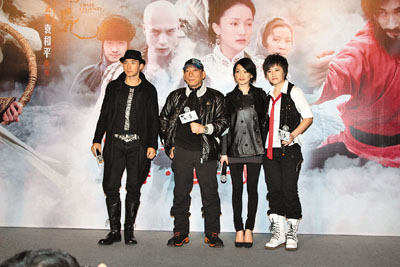 ■袁和平(左二)攜周迅(右二)、劉田井宏(左一)、蔣璐霞(右一)出席發佈會。 時尚宇 攝