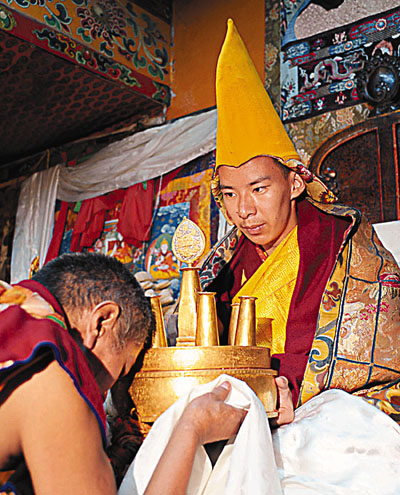 1994年9月間,扎什倫布寺高僧嘎欽.邊巴以普通人身份到桑吉卓瑪家做客時,發現他在觀湖時所看到的藏文字母「扎」,正是靈童父親索朗扎巴名字中的一個字母。堅贊諾布看到嘎欽.邊巴後說:「我認識你。」尋訪人員在他家用餐時,堅贊諾布拿過一個高僧的木碗說,「我也有一個這樣的碗,就放在扎什倫布寺裡。」高僧們大為驚訝。根據觀湖顯景,問卜算卦,自身吉兆十分明顯,以及家鄉景色等綜合特徵,扎什倫布寺的高僧一致認為該靈童是最具吉兆的候選靈童之一,有資格參加金瓶掣籤。果不出預料,後來在拉薩大昭寺金瓶掣籤時,堅贊諾布得到佛祖釋迦牟尼的法斷。(十一) ■摘自《告訴你一個真西藏》 劉偉著