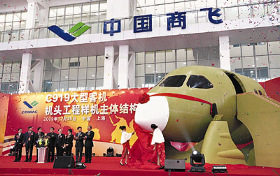 25日,由中國商飛公司和中國航空工業集團公司聯合研製的C919大型客機機頭工程樣機主體結構在上海正式交付。該機頭工程樣機作為大型客機研製的關鍵項目之一,首次採用模塊化定義規範開展全三維數字化設計和模塊化管理,設計製造僅用了半年時間。新華社