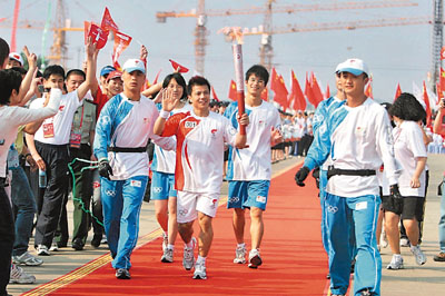 ■北京奧運火炬傳遞進入龍岩,第一棒火炬手張湘祥之後在北京獲得舉重金牌。 直曲 攝