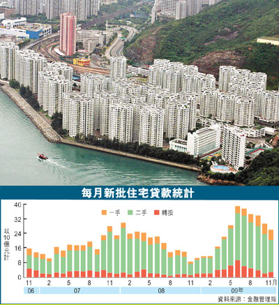 另一方面,基於拆息持續低企,新批出的拆息按揭比例由10月份的53.8%上升至11月份的56.6%,選用P按的比例由10月的44.8%下跌3.8個百分點至41%,其中大部分選用P按貸款的利率定於2厘至低於2.25厘的水平。而11月份按揭貸款拖欠比率及經重組貸款比率均沒有變動,分別為0.04%及0.1%。未償還按揭貸款總額增加0.9%至6,370億港元。
