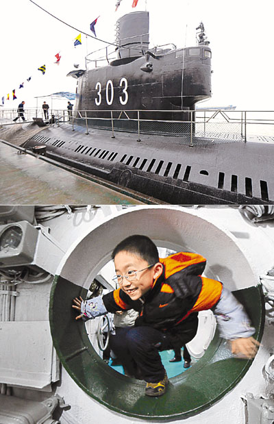 1日,停靠在武漢港21號碼頭、已退役的海軍303潛艇在武漢對公眾開放,吸引了不少市民前來一探潛艇的奧秘。據悉,303潛艇是中國自主建造的第一代常規動力潛艇,潛艇長74米,寬5.7米,排水量1,315噸。下圖為1名小孩在潛艇內部參觀。 新華社